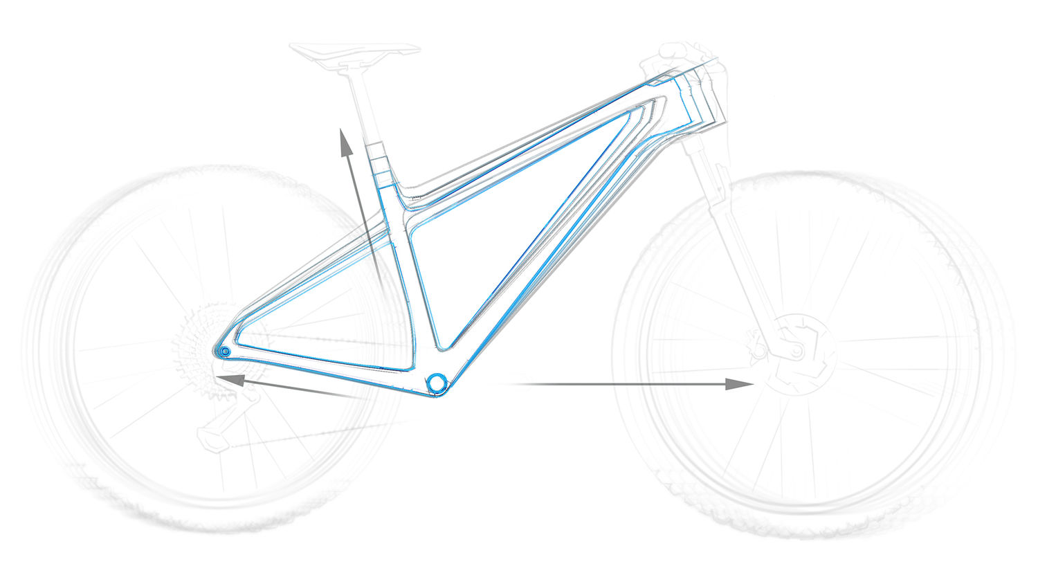 在碳纖維車體的型號上,導入了依車體調性的差異,來適配不同的後下叉長度,達到理想的操控性能,而其餘的幾何數據則保持一致。XC車款,騎士因為想保持最耐久的踩踏效率,因此待在坐墊上的時間比較多。隨著車架前伸量的增加,後下叉也會跟著增長,使不同身型的車手,其車架的前後重量平衡,都能有最佳的表現,從而實現出色的爬坡與過彎特性。