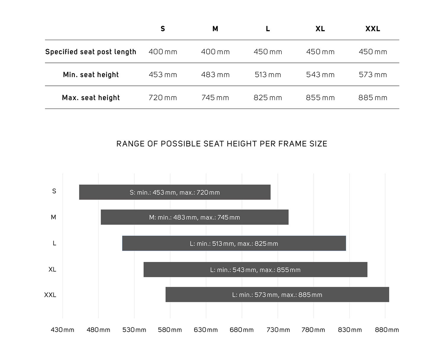 以下是根據原廠搭配的座管組件,可以達到的座墊高度。請注意,這個座墊高度會略微受所使用的座墊而稍微影響實際高度。