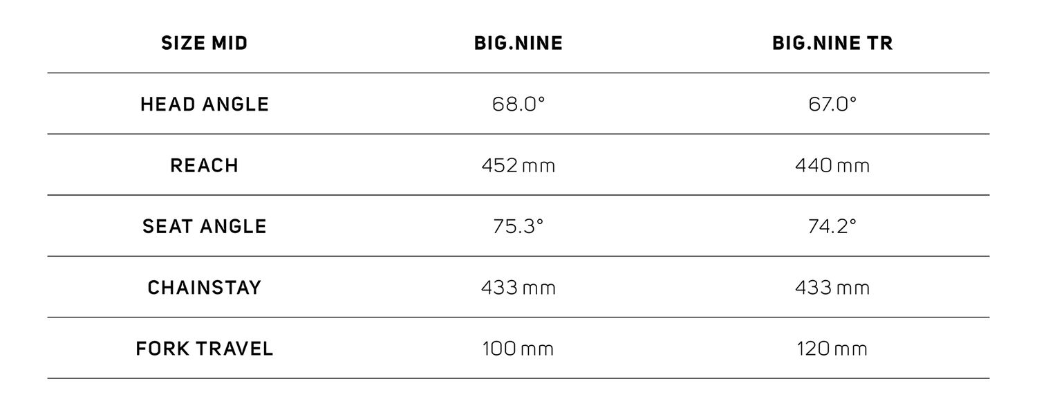 雖然它們使用相同的車架,但更換前叉行程會改變自行車的幾何結構。與配備 100 mm前叉的 BIG.NINE 相比,BIG.NINE TR 的前叉更長,頭管角度的設定更為緩和,這使得在高速騎行時更加穩定,更適合以林道為重點的登山車。