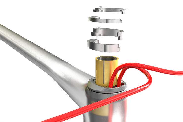整合於MERIDA TEAM SL 1P 一體式把手,可大幅延長前叉豎管的耐用性。應力分散結構,作用於龍頭與碳纖維前叉豎管的鎖固接觸部位,可以將鎖固所產生的應力均勻分散。
